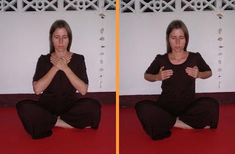 Завершив вращение, центры ладоней нужно наложить на центры молочных желез и девять раз мягко нажать. Само нажатие происходит на выдохе. Во время вдоха к нему следует готовиться, стараясь ощущать центры ладоней. Перед нажатием желательно почувствовать пульсацию в ладонях, хотя ее отсутствие не означает бесполезности самого действия.