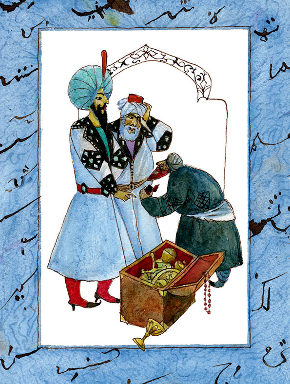 Калиф взял коробочку и велел насыпать торговцу полный кошель золотых монет.