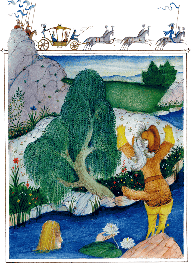 Маркиз де Карабас послушно исполнил всё, что посоветовал ему кот, хоть он вовсе и не догадывался, для чего это нужно. В то время как он купался, королевская карета выехала на берег реки.