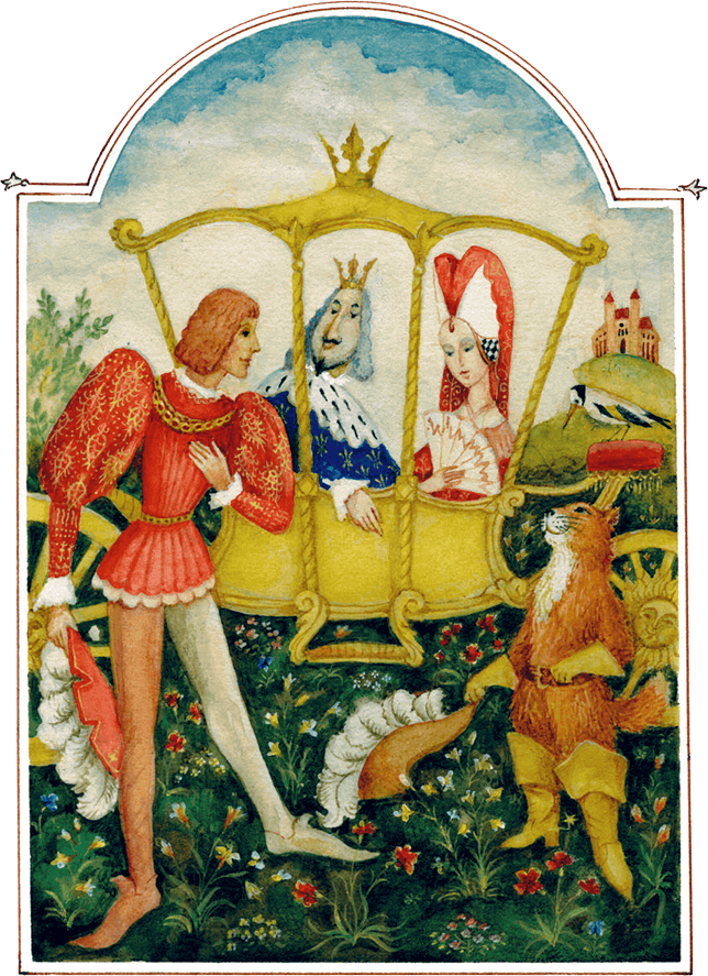 Кот услыхал, как гремят на подъёмном мосту колёса королевской кареты, и, выбежав навстречу, сказал королю: