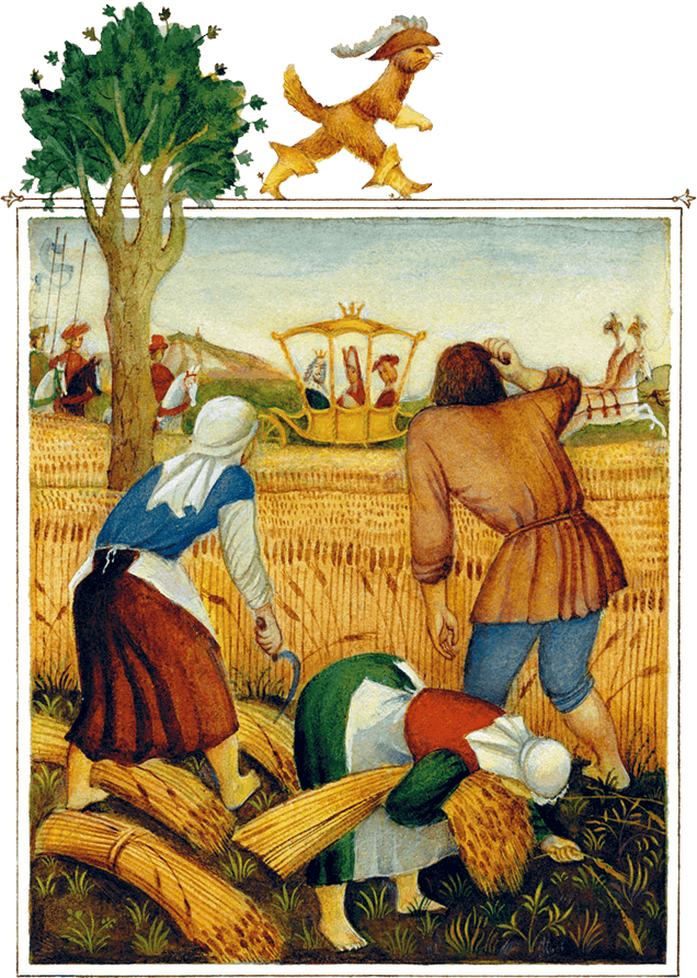 Между тем дядюшка-кот бежал всё вперёд и вперёд, пока не увидел по дороге жнецов, работающих на поле.