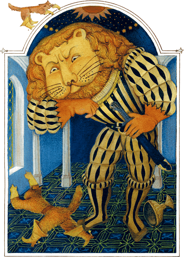 Кот до того испугался, увидев перед собой льва, что в одно мгновение взобрался по водосточной трубе на крышу, хотя это было трудно и даже опасно, потому что в сапогах не так-то просто ходить по черепице.