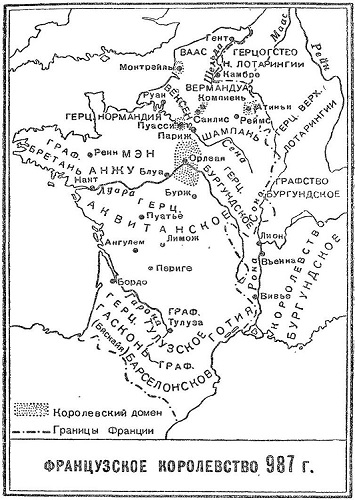 Королевство последних Каролингов и первых Капетингов имело на востоке границу совсем не такую, как теперешняя: начинаясь от устья Шельды и захватывая Ваасскую область и Гент, она шла приблизительно по течению этой реки, оставляя Турнэ и Валансьен Франции, Камбрэ – империи. От истоков Шельды она направлялась с запада на восток до: самого Мааса, по эту сторону Геннегау и Мобёжа, которые входили в состав империи. Затем она сворачивала на юг, отделяя Шампань от Лотарингии и далее герцогство Бургундское ют Бургундского графства (Франш-Контэ) и почти следуя ро течению Соны. Для упрощения обычно говорят, что потом она шла вдоль Роны, но в действительности Лионнэ, Форез, Вьеннуа, Виварэ находились вне Франции. Зато на юге граница королевства переходила за Пиренеи, от Ургельской епархии до Барселонской включительно, и граф Барселонский Борель взывал о помощи против арабов к своему отдаленному сеньору Гуго Капету[8]8