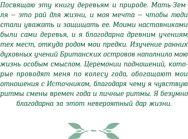 Следуя ежемесячным урокам деревьев, я стала лучше понимать природные циклы и в целом достигла большей осознанности. Знания о деревьях с Британских островов связывают меня с моими предками и их мудростью. Мудрые советы древних, исполненные глубокой силы, помогут нам выжить сегодня и призывают заботиться о планете, и благодарность моя бесконечна. Древнее изустное знание затерялось в веках – и все же возродилось подобно фениксу. Надеюсь, что календарь будет вам полезен для духовного роста и принесет радость.