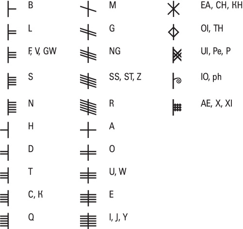 Древесный огам (ох-ам, охм) – это средневековый алфавит, состоящий из 25 сигил/букв/деревьев, которые и сегодня можно найти на каменных памятниках на территории Британских островов. Алфавит состоит из набора прямых линий, которые наносились на палки или камни и использовались на указателях или монументах. Каждая линия образует сигил и может чертиться вертикально (обычно читают снизу вверх) или горизонтально (обычно читают слева направо). Знаки наносятся вдоль стволовой линии – друима.