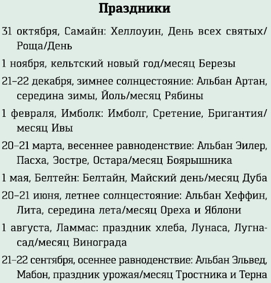 Современное языческое кельтское колесо года включает четыре лунных праздника, приуроченных к смене времен года, и четыре солнечных праздника. Знакомясь с календарем, вы узнаете о праздничных церемониях в конце того или иного древесного месяца, на которые они выпадают. В некоторых месяцах проводится две церемонии: одна для почитаемых деревьев и одна для праздника. Следует проверять даты солнцестояния и равноденствия для каждого года, поскольку они могут несколько меняться.