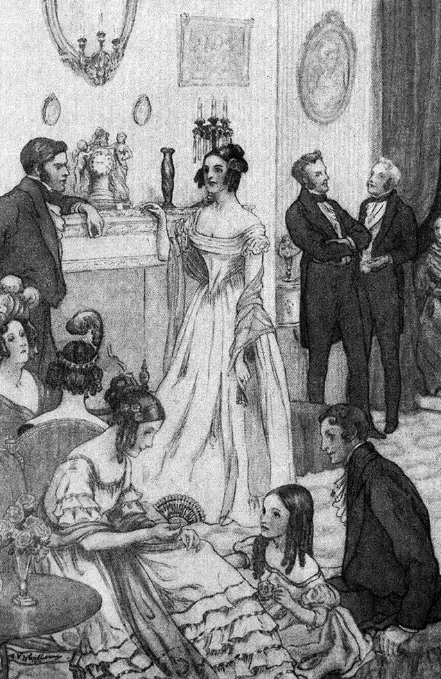 Мистер Рочестер отошел от Эштонов и стоит у камина в таком же одиночестве, что и она у своего столика. Она направляется к нему и останавливается по другую сторону камина.