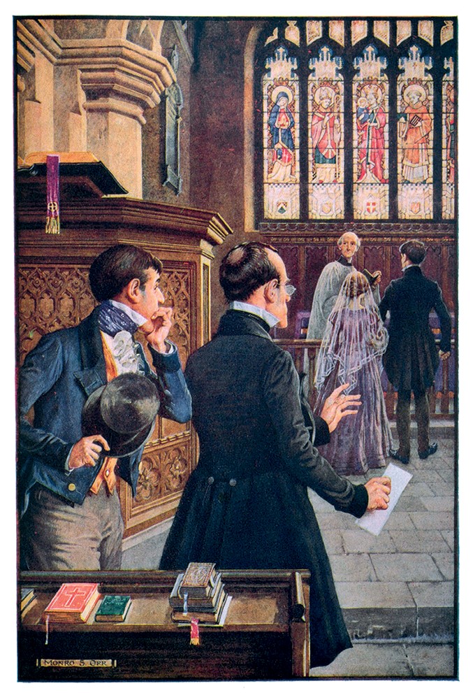 Мы заняли свое место у алтарной ограды. Услышав позади осторожные шаги, я оглянулась. Один из незнакомцев, несомненно джентльмен, шел по проходу. Служба началась. Было объяснено, во имя чего заключаются браки, а затем священник сделал шаг вперед и, слегка наклонившись в сторону мистера Рочестера, продолжал: