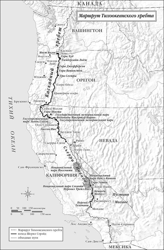 Впервые я узнала о нем всего за семь месяцев до описываемых событий, когда жила в Миннеаполисе, печальная, отчаявшаяся, на грани развода с человеком, которого все еще любила. Я стояла в очереди в магазине туристического снаряжения, собираясь купить складную лопату. От нечего делать взяла с ближайшей полки книжку под названием «Маршрут Тихоокеанского хребта, часть I: Калифорния» и прочла текст на обороте обложки. МТХ, было сказано там, это непрерывная тропа в дикой местности, протянувшаяся от границы Калифорнии с Мексикой до самой канадской границы и чуть в глубь территории Канады, вдоль гребня девяти горных цепей – Лагуна, Сан-Хасинто, Сан-Бернардино, Сан-Габриель, Льебре, Техачапи, Сьерра-Невада, Кламат и Каскадные горы. Расстояние по прямой составляло около 1600 километров, но сам маршрут был почти втрое длиннее. Пересекая по всей длине штаты Калифорния, Орегон и Вашингтон, МТХ проходит через национальные парки и нетронутые природные территории, через земли, находящиеся в федеральном, племенном и частном владении; через пустыни, горы и тропические леса; пересекает реки и скоростные шоссе. Я перевернула книгу и долго смотрела на лицевую сторону обложки – усыпанное валунами озеро, окруженное скалистыми утесами на фоне голубого неба. Потом поставила ее обратно на полку, заплатила за свою лопату и ушла.