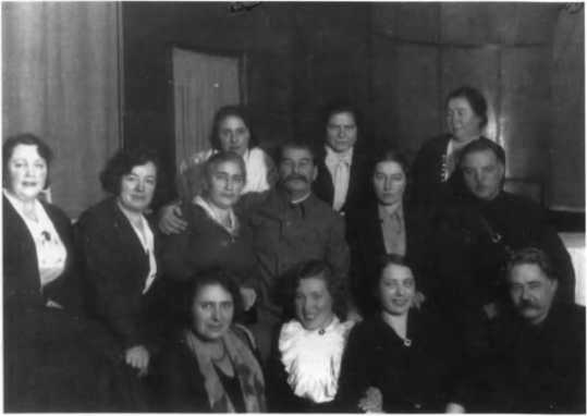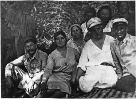 Пятидесятипятилетний юбилей Сталина в Кунцеве, 1934 год (снимал телохранитель Сталина, генерал Власик). Дальний ряд слева направо: Анна Аллилуева-Реденс, Дора Хазан и Зинаида Орджоникидзе; средний ряд: Мария Сванидзе, Мария Каганович, Сашико Сванидзе, Сталин и Полина Жемчужина (Молотова), Ворошилов; передний ряд: неизвестная, Евгения Аллилуева, Бронислава Поскребышева, неизвестный. РГАСПИ