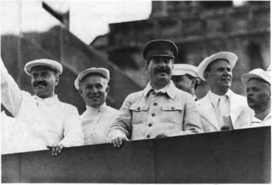 Вожди на трибуне Мавзолея, 1933–1934 годы. Передний ряд слева направо: Валерий Межлаук (Госплан), Молотов, Каганович, Сталин, Ворошилов, Калинин, Андреев и Чубарь. РГАКФД