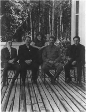 В переднем ряду, слева направо: Каганович, Маленков, Сталин и Жданов; в заднем ряду: неизвестный, дети Сталина Василий и Светлана, рядом со Светланой Поскребышев. РИА «Новости»