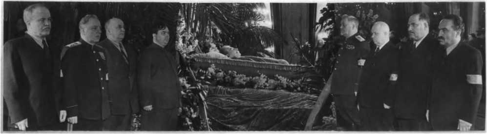 Гроб Сталина, март 1953 года. Молотов, Ворошилов, Берия и Маленков (слева); Булганин, Хрущев, Каганович и Микоян (справа). РГАСПИ