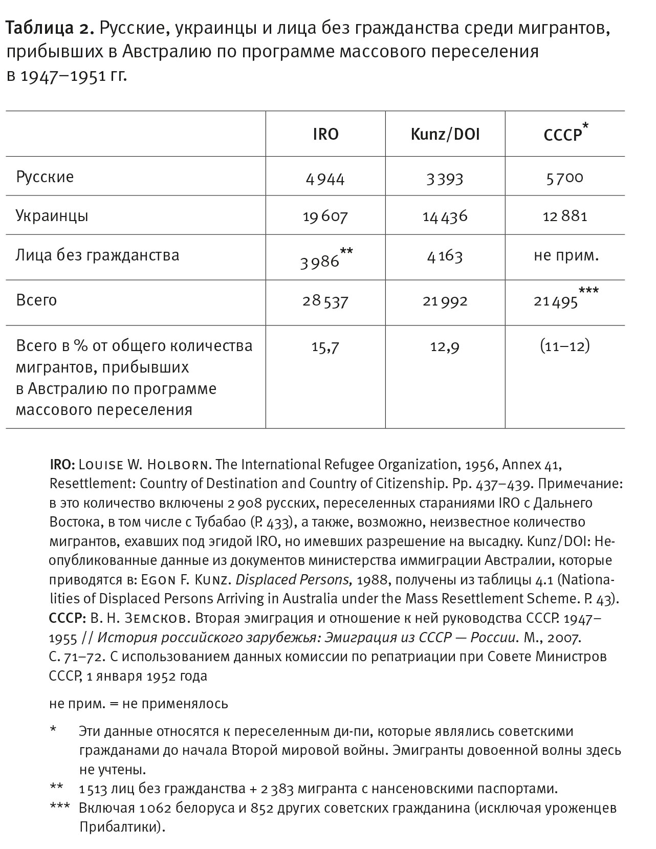 Показатели, полученные Эгоном Кунцем из австралийских источников DOI (Таблица 2), ниже на пару тысяч, вероятно, оттого, что IRO включила в свои данные по массовому переселению еще и некоторых из тех перемещенных лиц, которые под ее эгидой отправлялись в путь как мигранты с правом на высадку (Австралия классифицировала их как иммигрантов, въезжавших «с содействием» или «без содействия»).