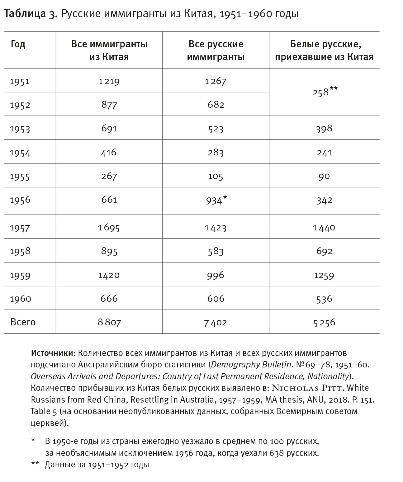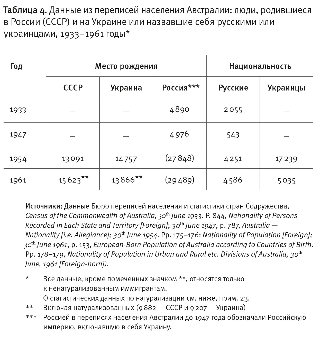 В их число не попадают русские, родившиеся за пределами России (Советского Союза). В переписи 1961 г. из людей, указавших местом своего рождения Польшу и Югославию, 2 006 и 2 518 человек соответственно заявили о том, что их национальность отличается от титульной. Вероятно, многие из них были детьми русских эмигрантов. При простом вычете показателей 1947 г. из показателей 1954 г., а показателей 1954 г. из показателей 1961 г. игнорируются также такие факторы, как количество умерших и уехавших. Вероятно, ежегодно умирало 100–200 русских, если можно судить по данным, собранным в Census of the Commonwealth of Australia, 30th June, 1961; Australian Life Tables, 1960–1962, Commonwealth Bureau of Statistics, Canberra, n.d. (Australian death rates). В конце 1940-х – начале 1950-х количество уехавших из страны было минимальным (не более 100 человек в год, считая русских, украинцев и лиц без гражданства), но в 1953 г. уезжать стало больше людей, так что к концу 1950-х количество покидавших страну людей достигло в среднем 200 в год (а в 1956 и 1961 гг. было зафиксировано необычайно много отъездов) (подсчеты основаны на: Oversea Arrivals and Departures data, Demography Bulletin, nos. 63–78, 1945–60).