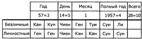Для человека, рождённого 14 января 1957 года, набор чисел и соответствующих гексаграмм, будет образован триграммами следующим образом:
