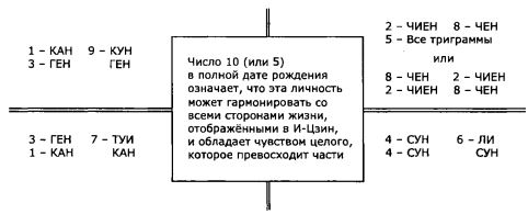 5 и 10 – это основные числа, относящиеся к полной дате рождения, они представляют целостную и динамичную гармонию, которая регулируется числом 5 и сохраняется в качестве единого целого числом 10, единством, которое больше всех частей вместе. Все триграммы И-Цзин связаны с числом 5, которое находится в центре, и числом 10, которое служит периферией.