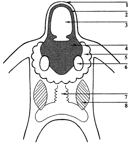 Рис. 2.Некоторые детали внутреннего строения энлонавта: 1 – сплошная кость черепа; 2 – головной мозг (только кора); 3 – костное полое образование, переходящее за легочным мешком в позвоночник; 4 – конический орган, соединенный с головным мозгом; 5 – большой легочный мешок; 6 – парные овальные сердечные мышцы; 7 – позвоночник и кости таза; 8 – парные органы, похожие на губчатые диски