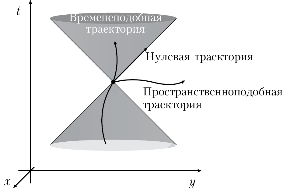 Пространственно-временные траектории, по которым объект движется со скоростью света, называются нулевыми (поскольку время равно нулю) или светоподобными (по очевидным причинам). В единицах измерения, при которых c = 1, на схеме пространства-времени нулевые траектории будут диагоналями, наклоненными на угол 45°. Именно при таком условии изменение пространственных координат и времени будет одинаковым. Движение со скоростью меньше скорости света будет происходить больше во времени, нежели чем в пространстве. Такие траектории называются временеподобными и располагаются более вертикально по сравнению со светоподобными. Мы также можем подумать и о пространственноподобных траекториях, которые располагаются более горизонтально, так как движение происходит не столько во времени, сколько в пространстве. Физические объекты не могут двигаться по ним (так как нельзя лететь быстрее света), но рисовать их никто запретить нам не может.