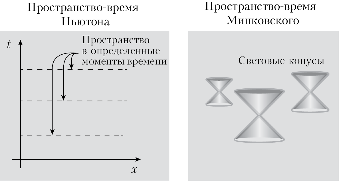 Световой конус заменяет собой винтажное представление Ньютона об абсолютном пространстве и времени. Стараясь изобразить его на рисунке, мы бы разрезали пространство-время на горизонтальные «моменты времени». При этом события, разделенные в пространстве, но происходящие одновременно, мы бы назвали «синхронными».