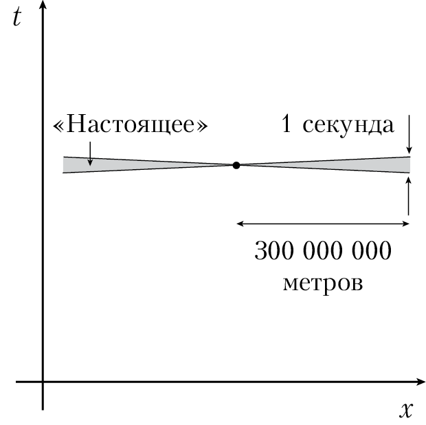 Еще раз. Разделение пространства-времени на слои, соответствующие горизонтальным перемещениям, кажется нам естественным, потому что в жизни мы движемся очень медленно по сравнению со светом. Для наших целей метры гораздо удобнее световых секунд. (За всю историю человечества лишь несколько космонавтов – экипаж «Аполлона» – были на расстоянии более световой секунды от родной Земли. И добирались они туда намного дольше одной секунды.) Если рисовать световой конус в метрах и секундах, нулевые траектории не будут наклонены под углом 45°, но станут почти горизонтальными, ведь за секунду свет пролетает огромное количество метров. На таких конусах трудно заметить разницу между временеподобным и пространственноподобным разделением событий, но все-таки она существует.