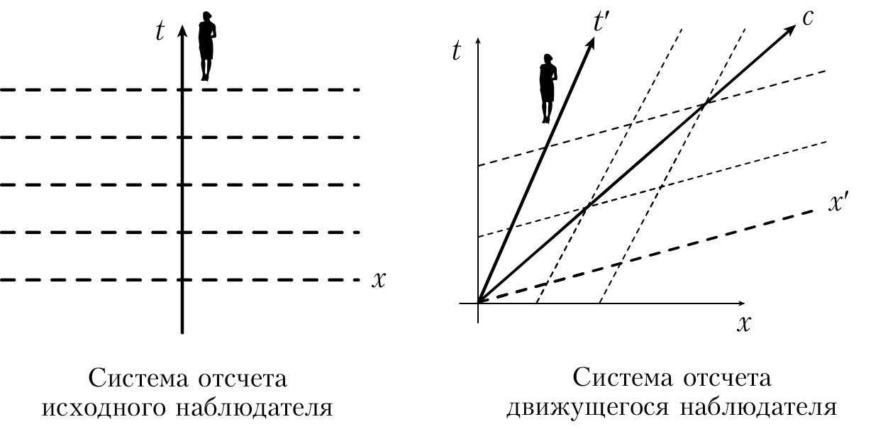 Можно проделать все те же действия и в пространстве-времени. Возьмем наблюдателя, который движется без ускорения, и поместим его в начало системы координат. Примем за ось t собственное время наблюдателя, которое показывают его часы. Проявив немного воображения, представим себе, что раз в секунду от наблюдателя исходят «бесконечно быстрые» лучи, которые расходятся во всех направлениях. Просто полет фантазии, не более: мы знаем, что бесконечных скоростей не бывает. Такие лучи представляют собой пространственноподобные линии, «перпендикулярные» мировой линии наблюдателя. Мы будем откладывать по ним координату x. У нас получилась система координат, инерциальная система отсчета, которая распространяется на все пространство-время. (Мы называем ее «инерциальной», поскольку наблюдатель движется без ускорения.)