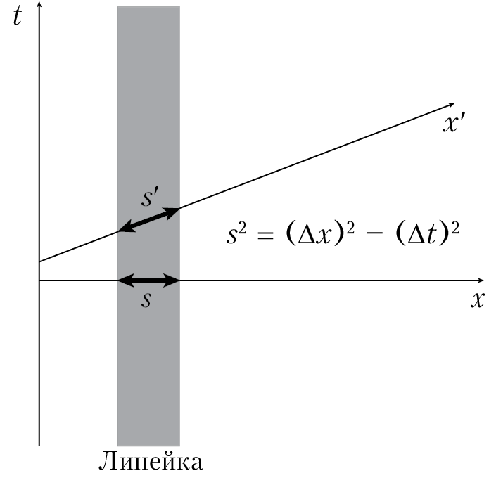 Знак «минус» объясняет, почему длина линейки в подвижной системе отсчета на самом деле короче, чем в неподвижной. Кажущееся увеличение длины на рисунке связано с тем, что линейка движется как в пространстве, так и во времени. В двумерной системе пространственных координат (на физической плоскости), переместив один конец линии вертикально при неизменном положении другого, мы неизбежно получим более длинную линию. В пространстве-времени все по-другому: даже небольшое смещение одного конца по времени приводит к сокращению пространственной длины. При этом, хотя такое изменение и совершенно реально, не следует думать, что объект физически сжимается. Нет. Но выбор другой системы отсчета приводит к изменению численного значения.