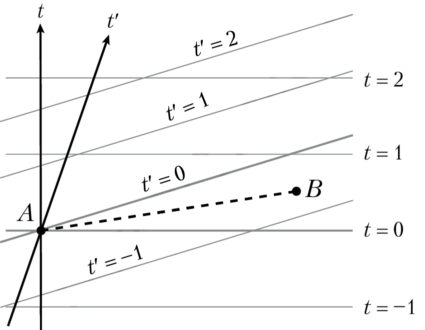 Представим себе, что наши два наблюдателя встретились (то есть начала обеих систем отсчета совпали), и назовем это событием А. Возьмем другое событие В, которое происходит на большом отдалении от события А, но почти сразу после него, если смотреть по исходной оси t.