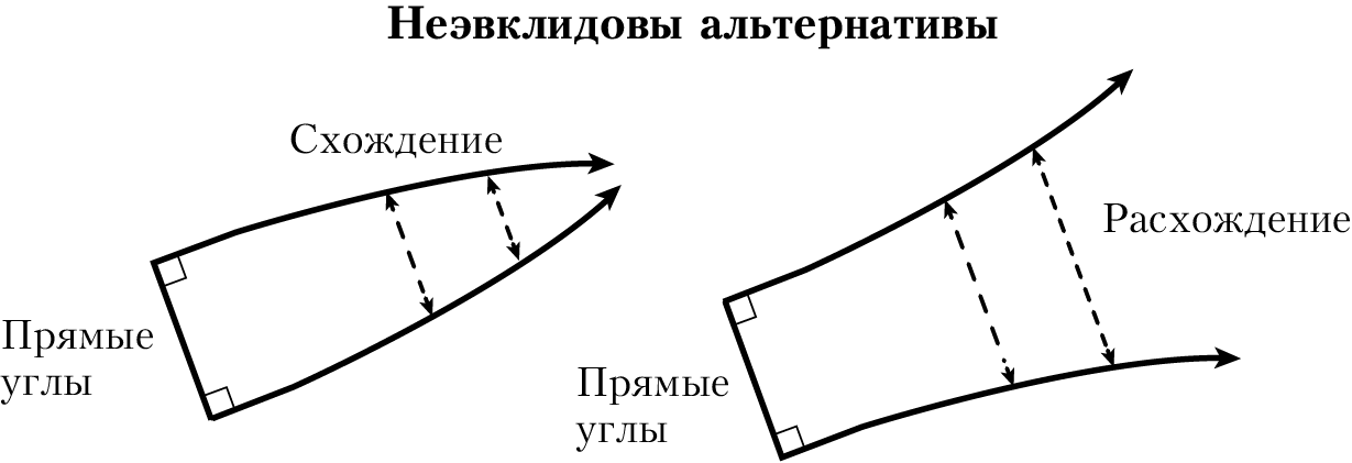 Легко представить себе этот «другой» постулат. Если Евклид утверждает, что две изначально параллельные прямые не пересекаются, значит, нам нужно сказать, что это не так. И здесь есть два варианта: прямые могут сходиться или же расходиться.