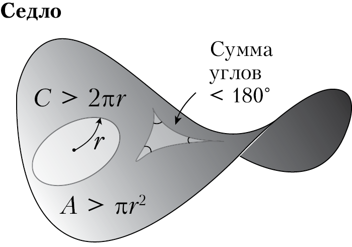 На таких поверхностях свойства окружностей и треугольников снова меняются, но в противоположную сторону: длина окружности радиусом r будет меньше 2πr, площадь круга – больше πr2, а сумма углов треугольника – меньше 180°.