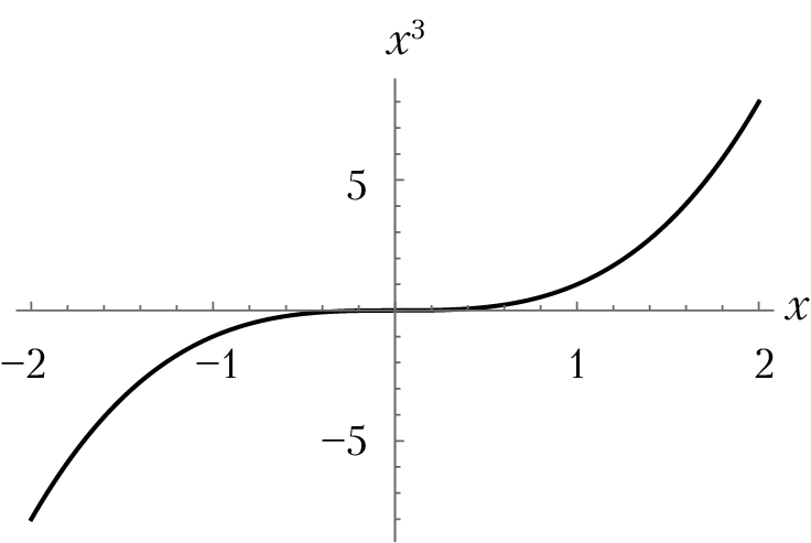 Эта функция никогда не принимает отрицательных значений, поскольку при умножении двух отрицательных чисел (в данному случае двух – x) получается положительное число. То же самое происходит при возведении x в любую четную степень. Графики таких функций будут похожи на параболу. Если же возводить x в нечетную степень, отрицательная сторона функции будет отрицательная, как на графике функции x3.