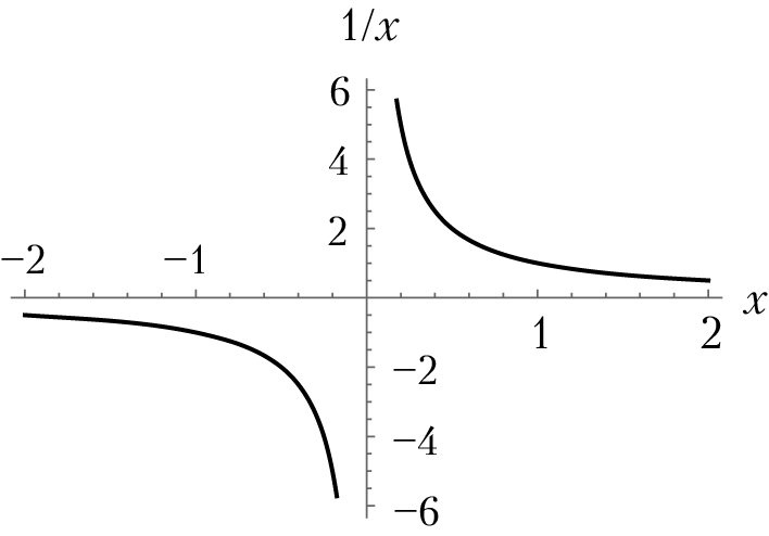 Тогда понятно, что x–1 = 1/x. Такая функция называется обратной. Ее график имеет разрыв при x = 0, но мы не должны этого бояться. Мы говорим, что в этой точке функция 1/x не определена.