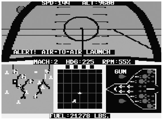 Многие ранние примеры такой защиты были откровенно скучными, например «Какое слово стоит двенадцатым на семнадцатой странице этого руководства?» В более удачных вариантах искомая информация тем или иным образом привязывалась к самой игре, представлялась как магическое заклинание или ответ на загадку, предложенную хитроумным противником. Учитывая лишенную фантастического элемента канву F-15 Strike Eagle, мы сделали выбор в пользу секретных кодов, использовавшихся для обозначения различных видов оружия. Мы разбросали их по всему буклету, чтобы с них труднее было сделать ксерокопию, и все же наша защита оказалась недостаточно надежной. У нас было 15 кодов, из которых игроку единовременно предлагалось выбрать какой-то один, и каждый код состоял всего из одной буквы. Вариантов было слишком много, чтобы гадать наобум, но переписать информацию вручную и приложить записку к пиратской копии было совсем не сложно.