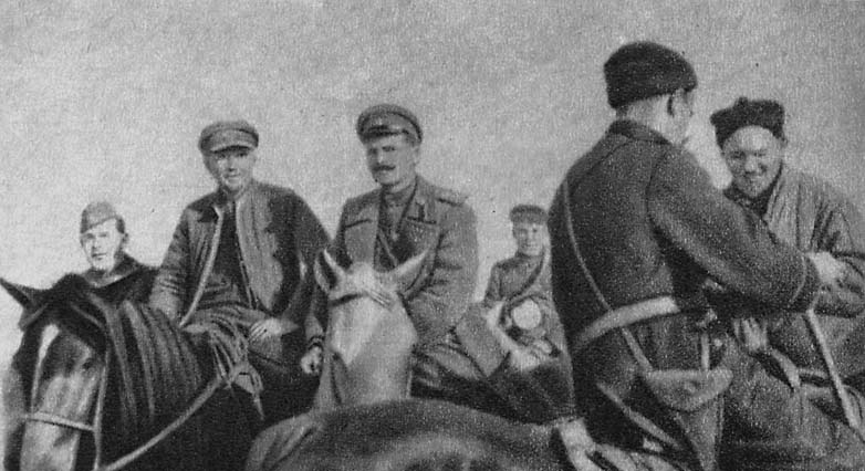 В голове колонны (справа) командир партизанского соединения С. А. Ковпак, комиссар С. В. Руднев, начальник штаба Г. Я. Базима. Докладывает начальник разведки