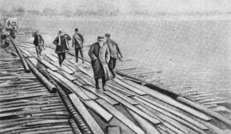В шесть часов утра началась переправа. Весь груз пришлось переносить на руках, так как даже под пустой повозкой мост погружался в воду на 20–25 сантиметров. Труднее всего было с 76-мм пушками. Я приказал переправлять их на руках. Когда артиллеристы под командой Деда Мороза, своего «папаши», как они его называли, тащили по мосту первую пушку, сердце сжалось. Мост ушёл под воду больше чем на полметра. Людей, тянувших пушку, течение сбивало с ног. Они срывались с моста, плыли, цеплялись друг за друга и снова под командой «папаши» тянули пушку по глубоко опустившемуся в воду мосту.