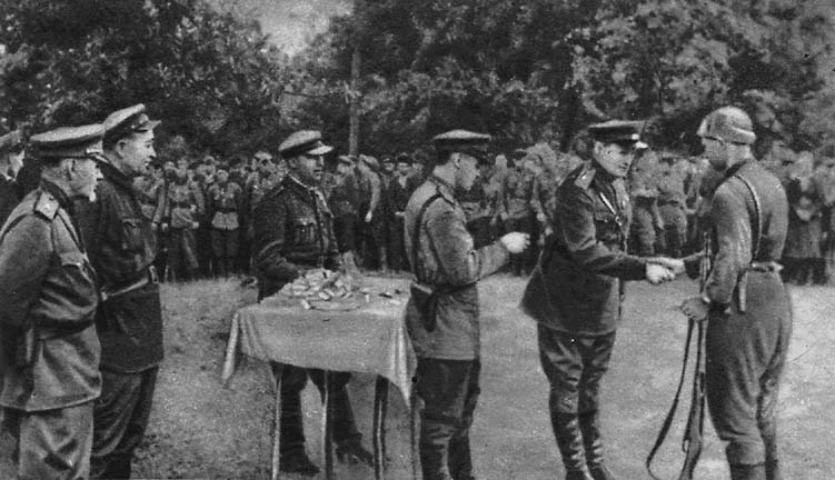 В дубовой роще у села Милашевичи. Начальник украинского штаба партизанского движения генерал-майор Строкач вручает правительственные награды партизанам. Слева С. А. Ковпак и Д. С. Коротченко