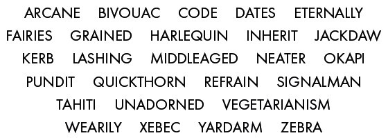 В английском алфавите 26 букв. Перед вами список из 26 слов. Все они начинаются с разных букв. Вам нужно вставить эти слова в сетку кроссворда, приведенную ниже (желательно делать это карандашом). Слова могут располагаться по горизонтали или по вертикали.