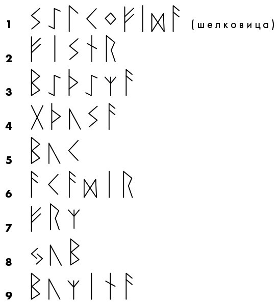 Взломав шифр, прочтите руны. Каждая руна – одна буква. Если первая группа рун читается как ШЕЛКОВИЦА, названия каких деревьев закодированы в следующих строках?