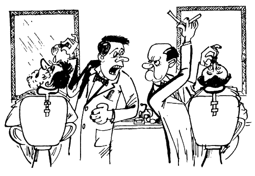 Этих слов вполне достаточно, чтобы тихая парикмахерская, расположенная на тихой улочке, вдруг стала ареной, где разыгрывается страшная буря, ураган, девятибалльный шквал. Потрясая бритвой, парикмахер готов наброситься на вас и, без сожаления, зарезать. Он громко на весь зал взывает к своему коллеге: