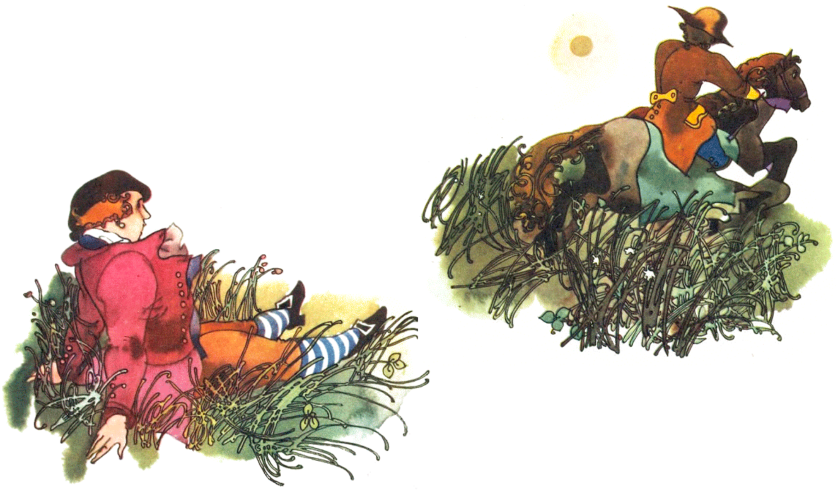 Однако препираться было некогда; вскочил фермер на коня и пустился в погоню за Джеком Хэннефордом. Услышал старый солдат стук копыт и смекнул, что это фермер за ним гонится. Улегся он на землю, одной рукой глаза прикрыл, другой на небо указывает и сам туда же глядит.