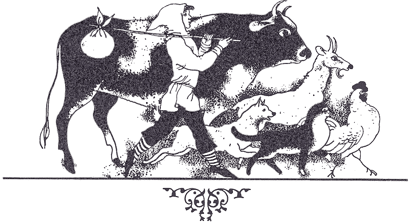 – Мясник, мясник, убей быка! – попросила старушка, – Не хочет бык выпить воду, не хочет вода залить огонь, не хочет огонь сжечь палку, не хочет палка прибить собаку, не хочет собака укусить поросенка, не хочет поросенок лезть через ограду, не успею я засветло попасть домой.