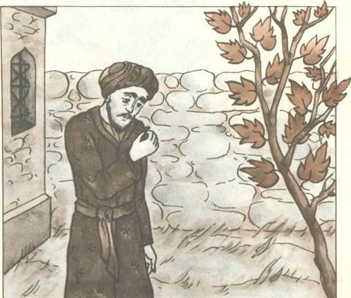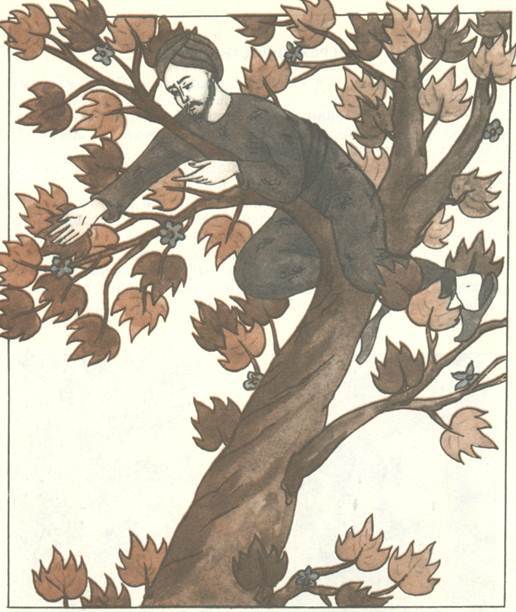 Кутуб-хан огорчился и полез на дерево. Трудно ему пришлось, но ведь он лез за деньгами! К удивлению всей деревни, он добрался до самой вершины и отобрал у воровки своё достояние. Но слезать оказалось труднее – ему б догадаться да уронить монету на землю… Кутуб-хан застрял между небом и землей и стал звать на помощь.