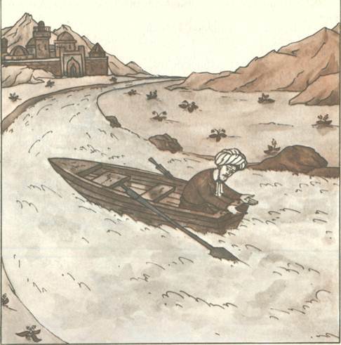 Добрёл звездочёт до большой реки. Долго топтался на берегу, но вот какой-то добрый рыбак взял его в лодку и повёз на другой берег.