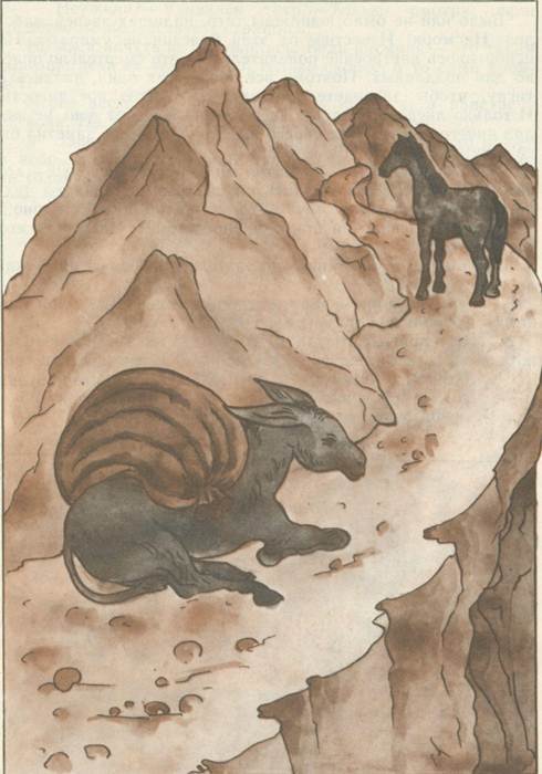 Дорога пошла в гору. Осёл чувствует, что вот-вот упадёт, и в третий раз просит лошадь: