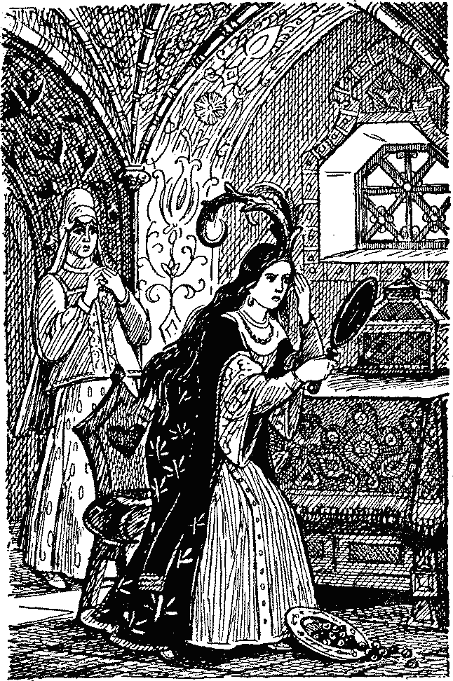 Услышала царица те речи, заплакала пуще прежнего. Мамки, няньки да сенные девушки подхватили ее под руки и увели в терем.