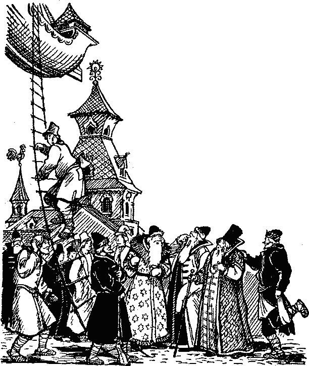 Тем временем народу набежало – глазом не окинуть: все, кто на царский пир сошлись, съехались, и все горожане на летучий корабль да на Ивана глядят, глаз не сводят. А царь кричит: