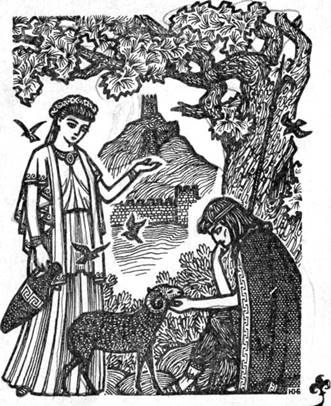 Однажды дочь архонта пошла на могилу своей рабыни покормить птиц и увидела там пастуха. Юноша сидел задумавшись. Красивое смуглое лицо его выражало грусть, а пышные кудри рассыпались по плечам и шевелились на ветру.
