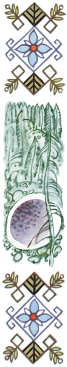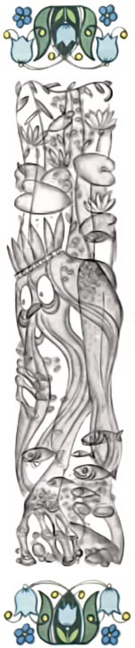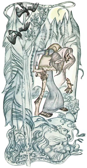 Положил Скалолом голову царевне на колени и заснул крепким сном. А царевна глаз не спускает с моря. Вот всколыхнулось море раз, другой, третий. Стала царская дочь тормошить Скалолома, а тот никак не просыпается. Вот уже море четвертый раз всколыхнулось и в пятый, а царевна все не может разбудить своего спасителя. Вспомнила наконец о булавке, уколола руку Скалолома. Тот мигом вскочил на ноги и схватил свой шестипудовый меч.