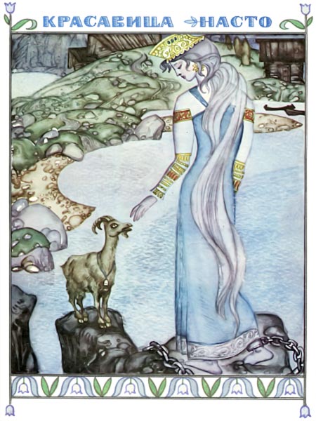 Вышла красавица Насто на берег, золотой цепью звенит. Выскочил тут из-за камня царевич, молотом так хватил, что разлетелась цепь золотая на мелкие куски.