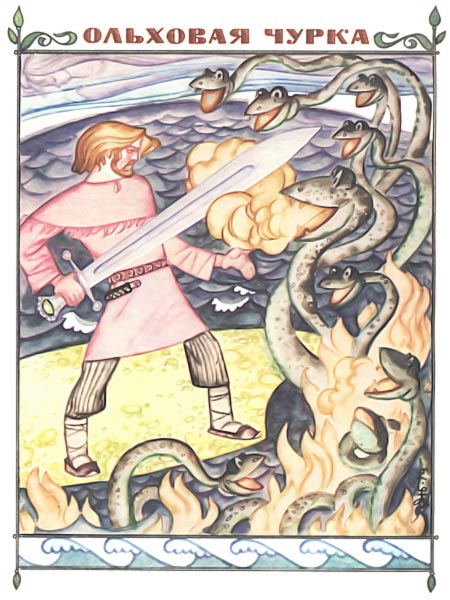 Положил голову на колени девушке и заснул. Мало ли, много ли времени прошло, всколыхнулось море раз, другой, третий… Царевна давай молодца будить, тормошить, а Ольховая Чурка все спит. Всколыхнулось море в четвертый, в пятый раз, волны до неба взметнулись, а она все не может его разбудить. Вот уже в восьмой раз вздыбилось море, огненные полосы пробежали по гребням волн. Тут царевна вспомнила о ноже и ткнула острием Ольховую Чурку в руку. Когда море в девятый раз вздыбилось, он уже был на ногах. Вышел из воды девятиглавый змей, увидел Ольховую Чурку и говорит: